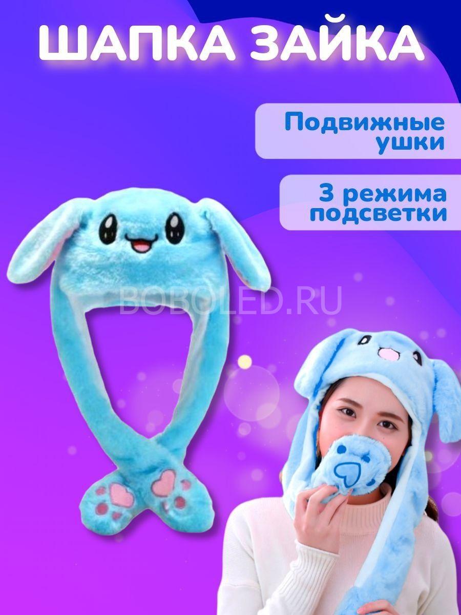 Шапка Зайка синяя светящаяся с поднимающимися двигающимися ушками ОПТОМ